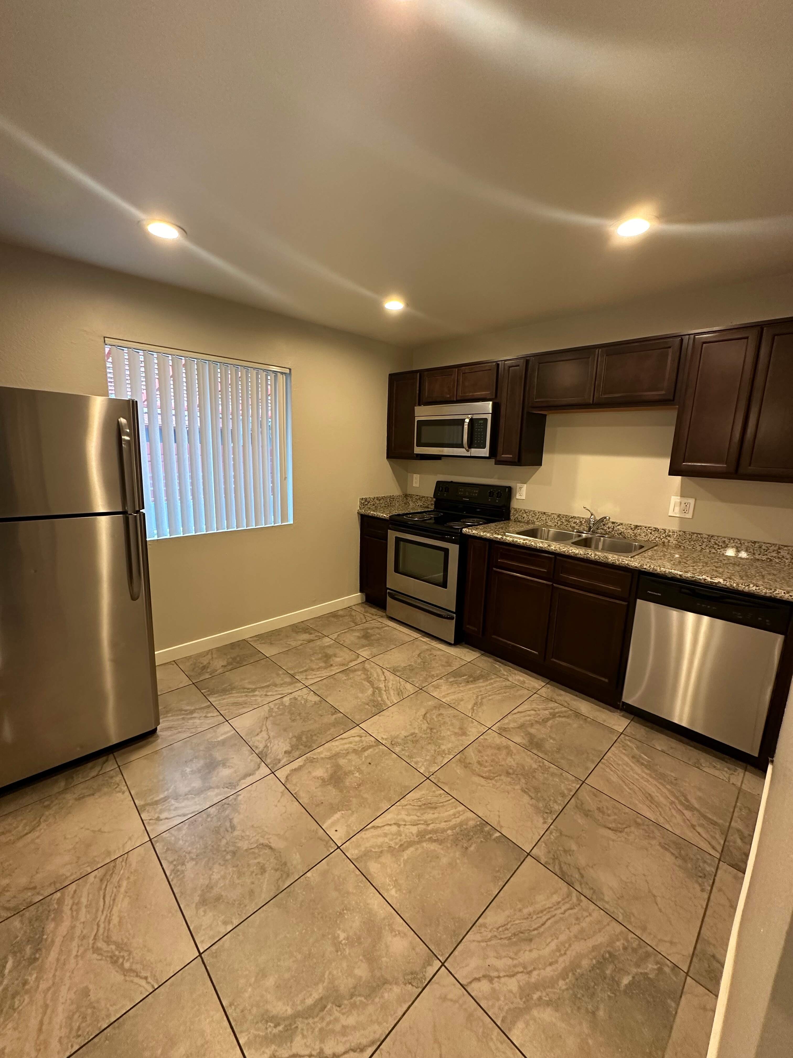 Spacious kitchen featuring stainless steel appliances. Newer flooring throughout.