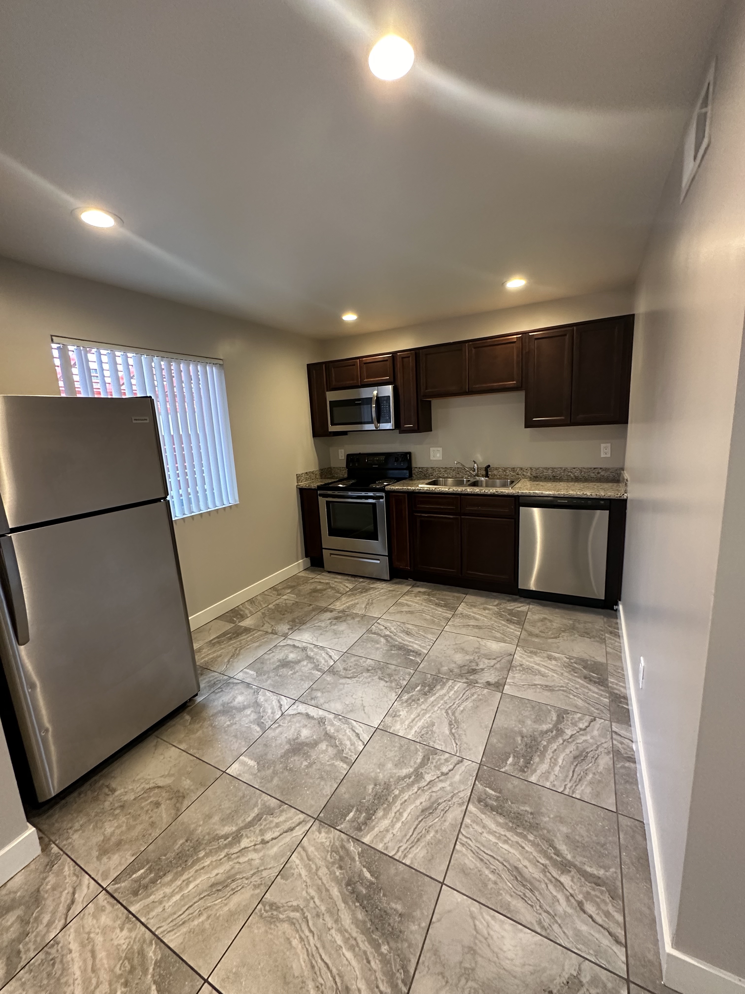 Spacious kitchen featuring stainless steel appliances. Newer flooring throughout.